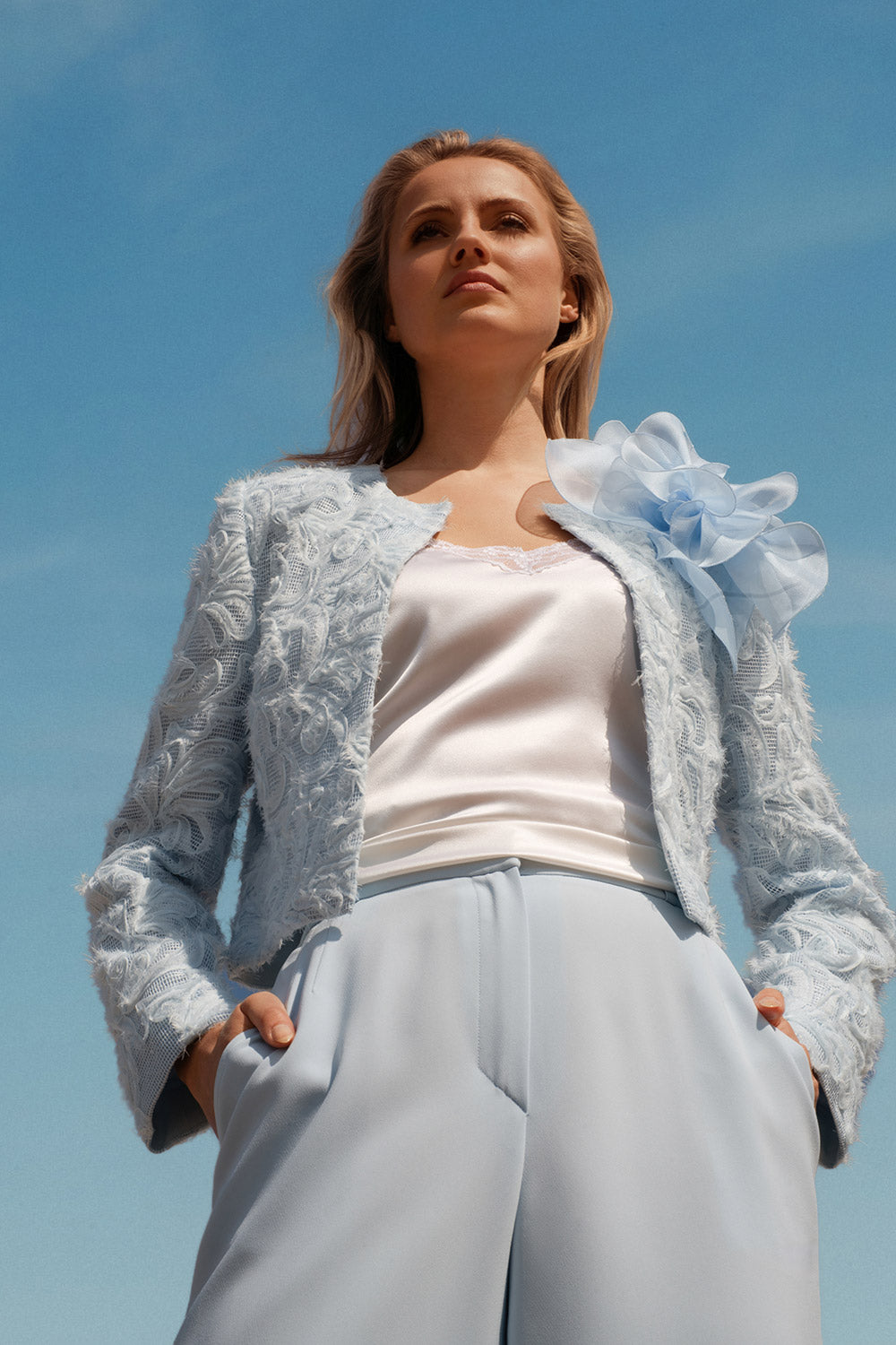 Diese Jacke überzeugt durch ihre kurze, strukturierte Silhouette und eine elegante, klare Linienführung. Die kragenlose Verarbeitung mit rundem Ausschnitt sorgt für eine ruhige, hochwertige Ausstrahlung und unterstreicht die feminine Form des Modells. Die gefütterte Verarbeitung sorgt für angenehmen Tragekomfort sowie eine stabile Formgebung. Die langen Ärmel greifen die klare Linienführung auf und sorgen für eine ausgewogene Proportion. Die Vorderseite wird über drei dezent platzierte Haken geschlossen, wodurch eine ruhige, elegante Vorderansicht entsteht. Die hochwertige Spitze verleiht dem Modell zusätzliche Tiefe und eine hochwertige textile Wirkung.