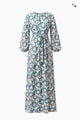 Bodenlanges, schwingendes Kleid aus bedruckter Seide in blau-weißem Naturprint.