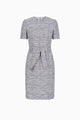 Fitted sheath dress made of jacquard in grey-blue with short sleeves and a tie belt.