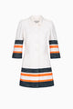 • With classic waist strap, which is fixed with two flat fabric-covered buttons in turquoise